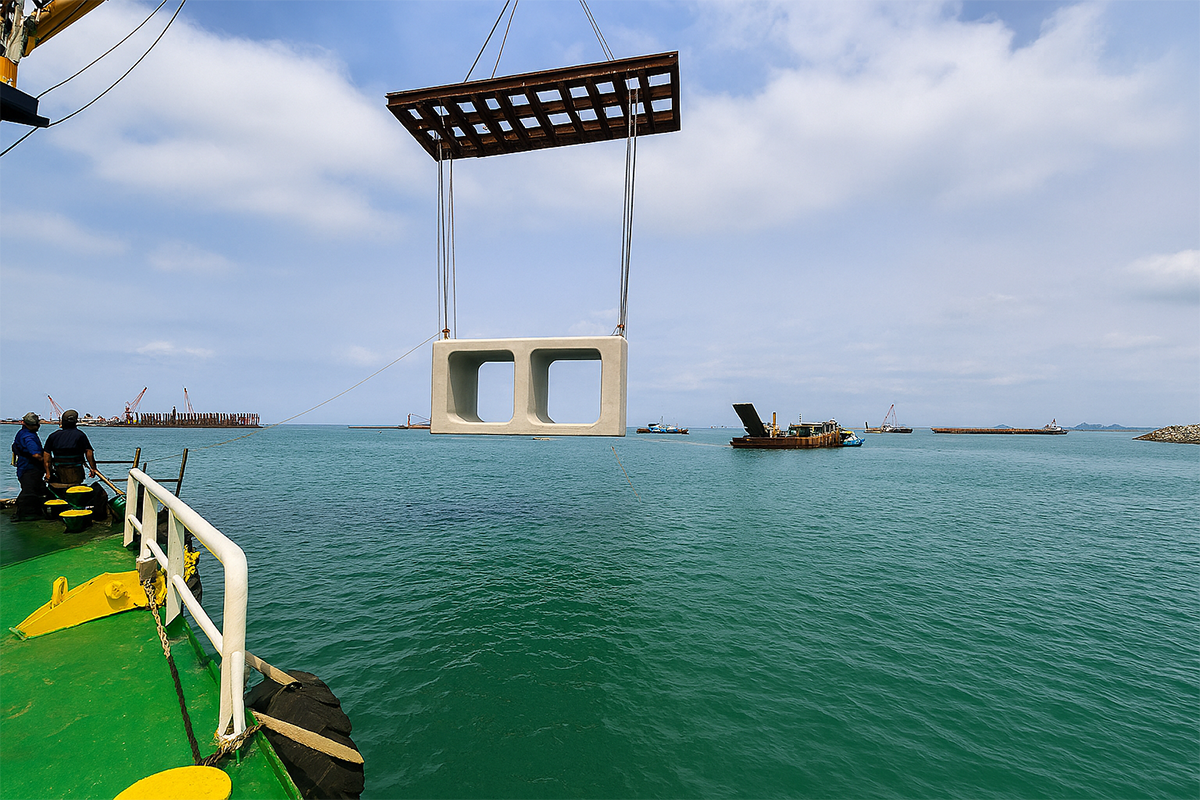 Intake PC box line 723m, Discharge PC box 598m, Grab dredging 261,481m3, crushed stone 209,219m3, armor stone 17,829m3, PC block 1,207ea