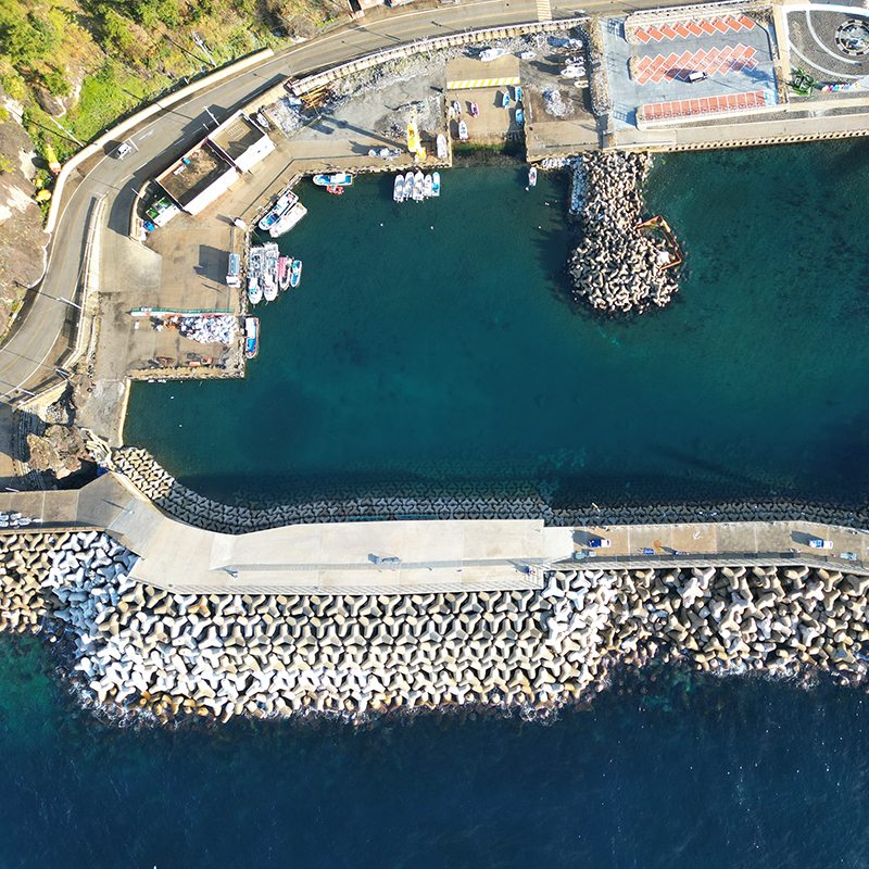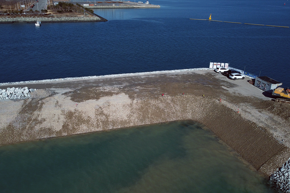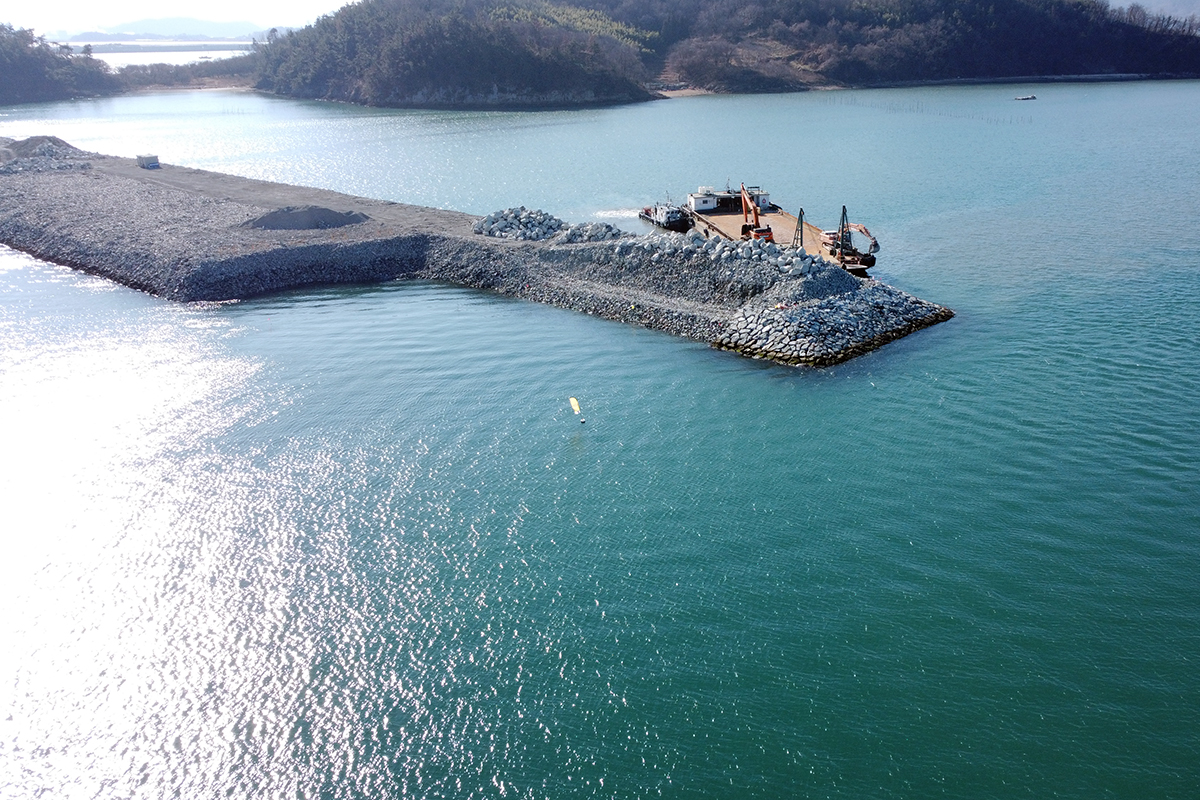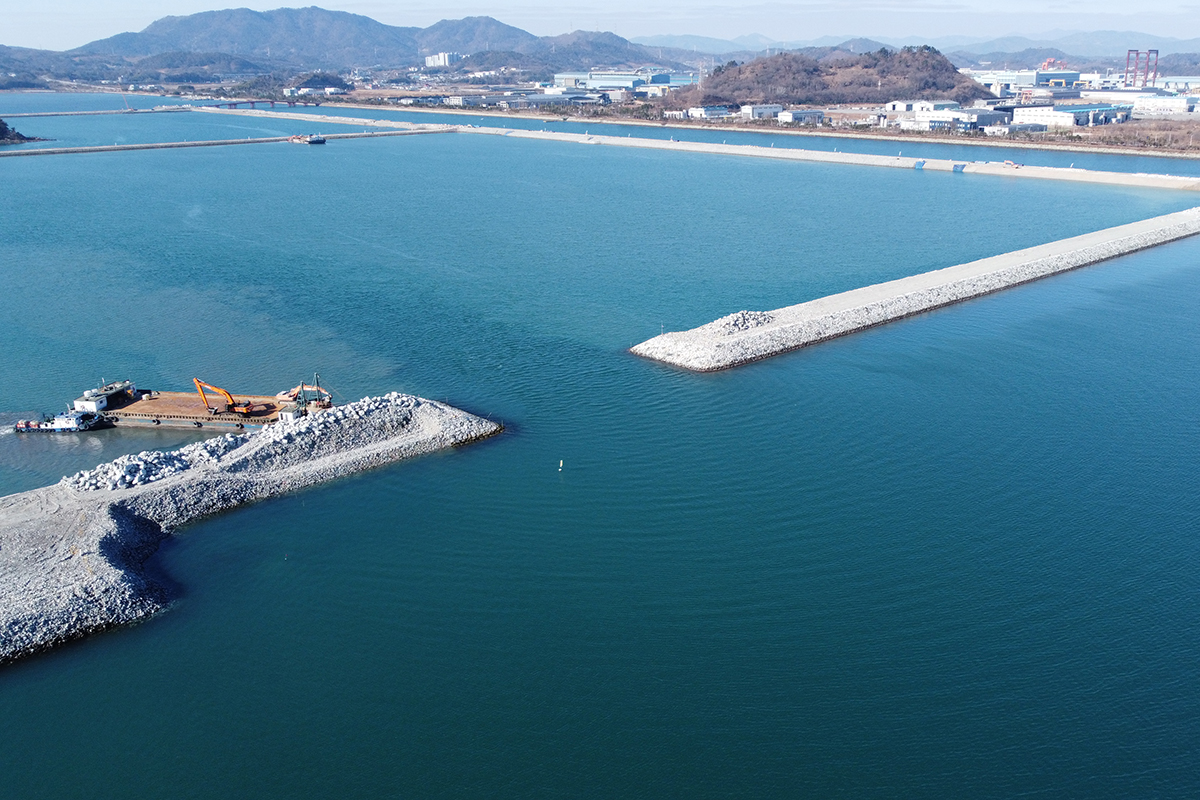 사석 투하 1,528,264m3, 피복석 투하 73,565m3, 석재 고르기 68,682m2, 콘크리트 블록 설치 195ea, 해수 소통구 설치 8기석 투하 1,528,264m3, 피복석 투하 73,565m3, 석재 고르기 68,682m2, 콘크리트 블록 설치 195ea, 해수 소통구 설치 8기